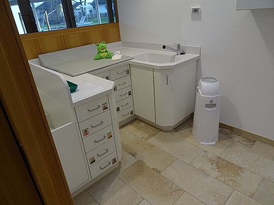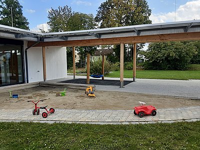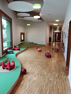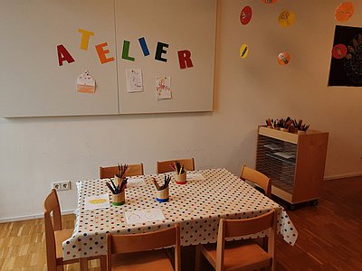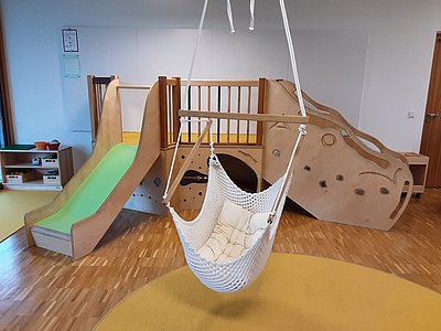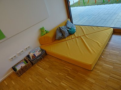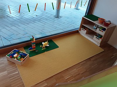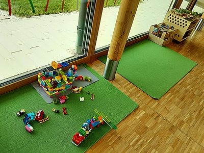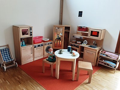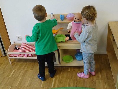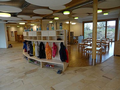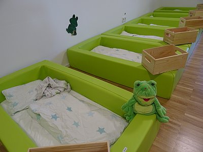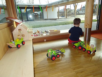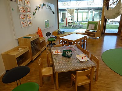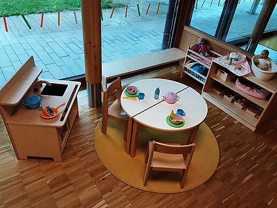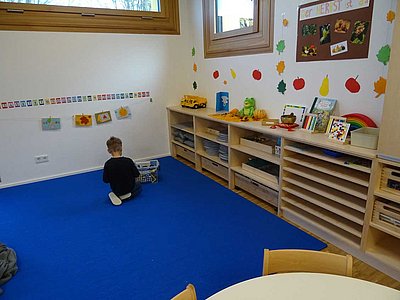 Die offene Arbeit mit Stammgruppen in der Krippe unterscheidet sich in den Grundprinzipien nicht von der im Kindergarten. Ein Begegnungsraum, zu dem die Krippenkinder eigenständig und jederzeit Zugang haben, ist der zentrale Ort des gruppenübergreifenden Spiels. Die Öffnung des gesamten Krippenbereichs ist auf einen bestimmten Zeitrahmen festgelegt.